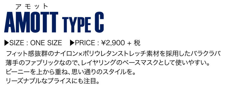 薄手のファブリックなのでビーニーを重ねたり、レイヤリングのベースマスク、ヘルメットインナーとしても使いやすいアイテム。
