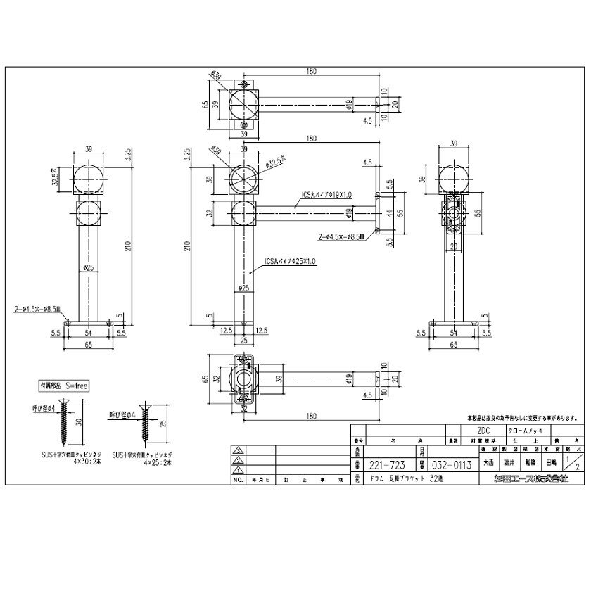 【ご確認下さい】当商品はドラム 足掛ブラケット 32 通 です 【仕様】 適用パイプ径:φ32 材質:ZDC 仕上:クロームメッキ 【特長】 ・回転するため左右勝手がなく、壁面(巾木)への支持も スライドさせることで上下できます。