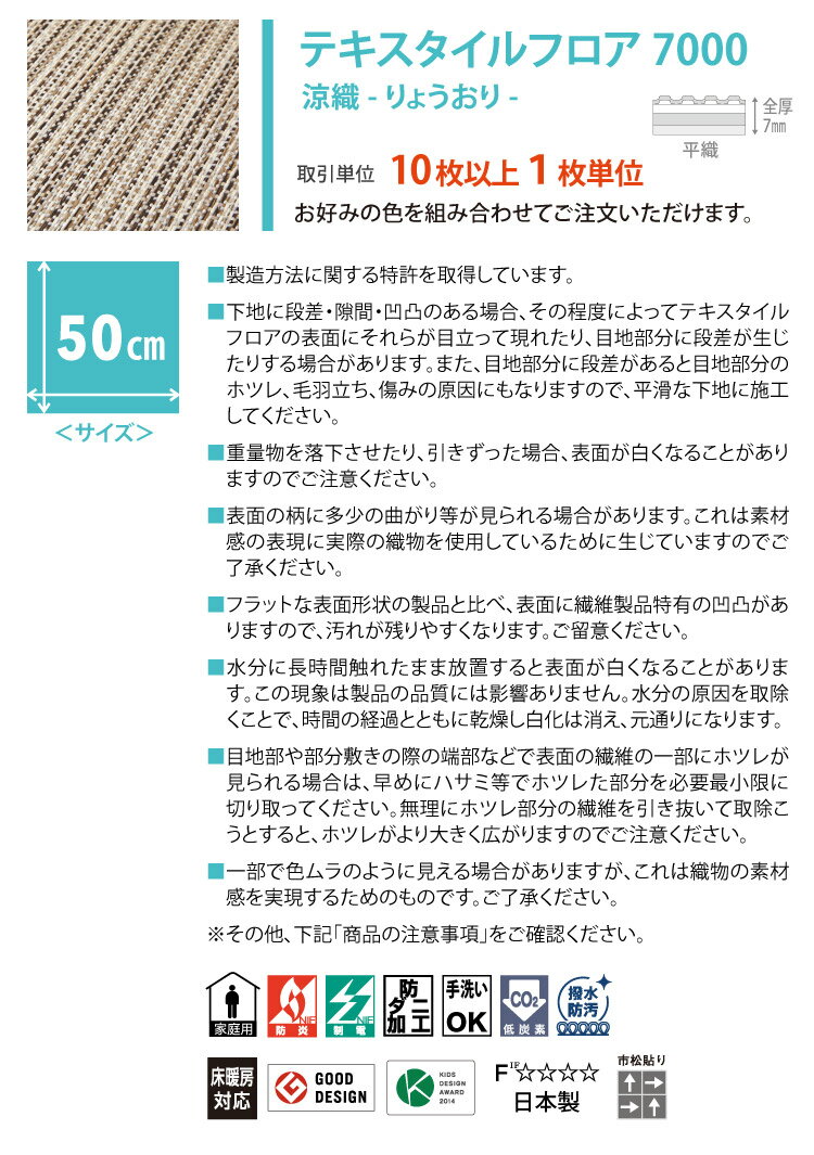 掲載品番FF7001 FF7002 FF7004 FF7005 FF7007 FF-7001 FF-7002 FF-7004 FF-7005 FF-7007 メーカー希望小売価格はメーカーカタログに基づいて掲載しています 東リタイルカーペット注意事項> ファブリックフロアの敷き方・ご注意> お手入れ方法・維持管理ならびに使用上のご注意> 機能性マークについて> 選ぶ際のご注意> テキスタイルフロア7000 涼織のご注意 副資材はこちら見切り材コーナージョイント 東リ ファブリックフロア シリーズ他のシリーズをチェック 他にオススメのタイルカーペットのりなしタイルカーペットのりつきタイルカーペット吸着式タイルカーペット ページの上へ モバイルページ